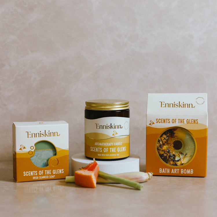 Inspired by the lush, rolling hills and mythical landscapes. Let the freshness of Scents of the Glens citrus and woody notes transport you to ancient lands sown by the same generations and the sense of belonging.